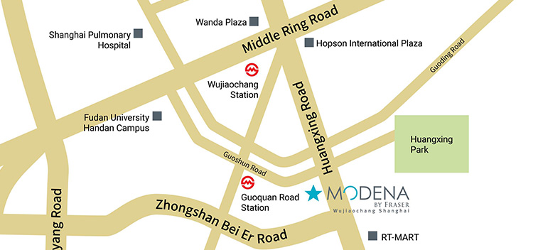 Located in the heart of Wujiaochang, Shanghai’s bustling commercial hub, Modena by Fraser Wujiaochang Shanghai offers exceptional accessibility to the city’s transportation network, with bus stops within walking distance and the Metro Line 10 and Line 18 Guoquan Road Station nearby. The area is also home to many world-renowned enterprises and shopping malls, providing unparalleled convenience for daily commuting and leisure.