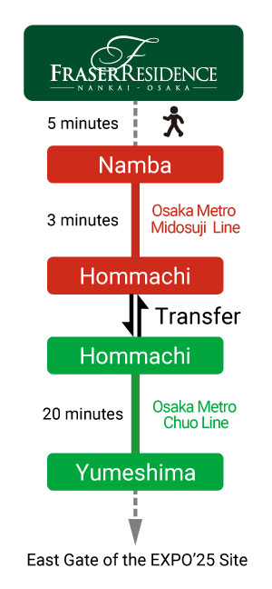 Fraser Residence Nakai, Osaka is located in the heart of Namba and we are just a 3 - 5 minutes walk from Namba Station.